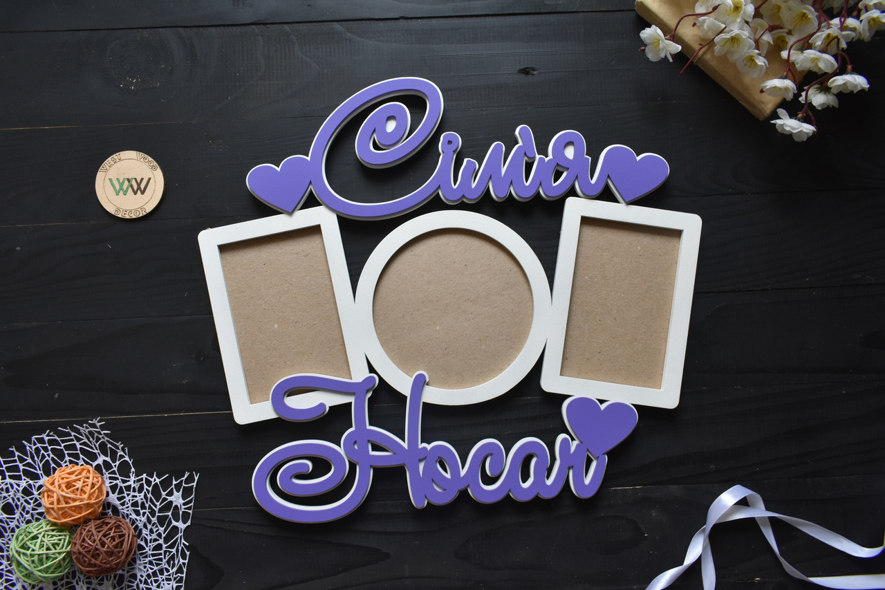 Фоторамка з дерева на 3 фото з прізвищем. Дерев'яна іменна фоторамка ручної роботи.