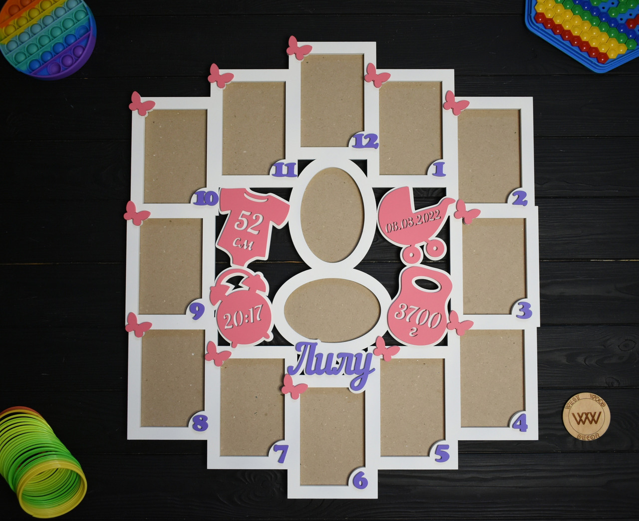 Дитяча метрика на перший рік. Колаж із дерева на 12 місяців (будь-яке ім'я)